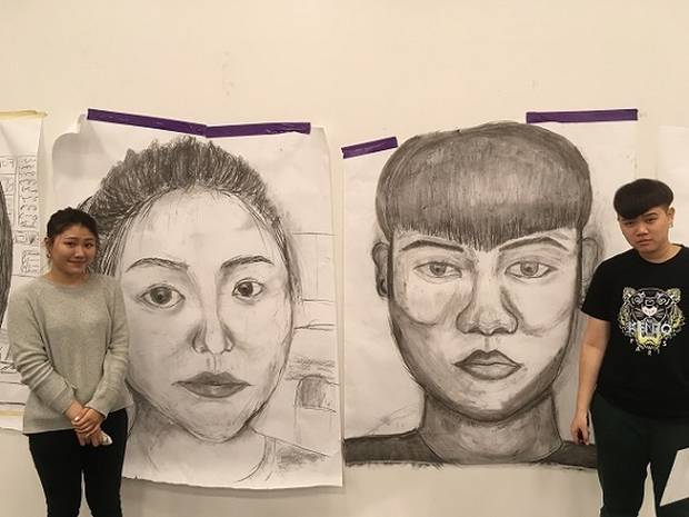 之後,我們分為三組,分別是印刷、大型畫像和油畫。我當時在畫像小組中。我們小組中的每個人都在牆上掛了一塊大紙,我們用木炭畫了自畫像。這是我第一次這麼大地畫出自己。我拿著鏡子,仔細觀察和畫出我的臉。那天早上我們作的藝術品對IB作品集和我申請藝術學校的作品集都非常有幫助。